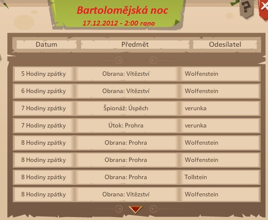 Každý hráč prožije v Empire tzv. Bartolomějskou noc. V noci z 16. na 17.prosince spřátelená vojska aliancí Heartbreakers a Peklíčko zaútočila na hrad Wolfenstein. Přeživším udatným bojovníkům děkujeme, ostatním proboláváme sláva a budujeme pomníky ;-)